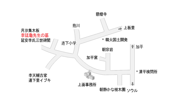 加平郡胎封里山 115-1 番地に造られた月沙 李 廷龜 先生の墓所だ。月沙先生の墓が一番前にあり、上に仁租の時代の礼曹判書と大提学を務めた長孫である李一相の墓があり、その上に礼曹判書と大提学を務めた長男である李明漢の墓がある。子孫の墓が上にあるということは、順に墓をつくれば逆賊が出る墓の相であるといって、反対 ( 易葬 ) に墓をつくったと伝えられている。