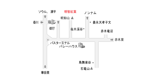 明智山は海抜 1 、 267m の京畿道で二番目に高い山だ。徐々に山登り人口が増えながら年間 10 万名以上の観光客が訪れるが、渓谷の滝と樹木が調和して優に壮観だ。 特に秋になると数十年たった枯木と奇岩怪石の調和の中に秋紅葉の絶景を満喫しながら山登りを楽しむことができる所で、明智滝や竜沼など絶景があちこちに散在している。 明智山は清渓山とともに韓国の生態・景観保全地域の中で 6 番目に生態・景観保全地域に指定されており、漢拏山、智異山の次に昆虫相の豊かな地域だ。生態探訪及び自然学習などの機会を提供して自然環境保全に対する意識を涵養しようと、明智山郡立公園の入口に [ 生態探訪学習院 ] を開館して各種の薬用、珍しい植物園、野生花などの自然学習院や蛍火洞窟、昆虫体験映像物、植物昆虫魚類の展示など生態体験の機会を提供している。 近くの民宿施設が利用できる。