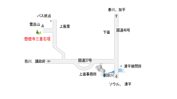 - バス : 東ソウルターミナルまたは上鳳ターミナルで春川行き乗車後、 清平 で 下車