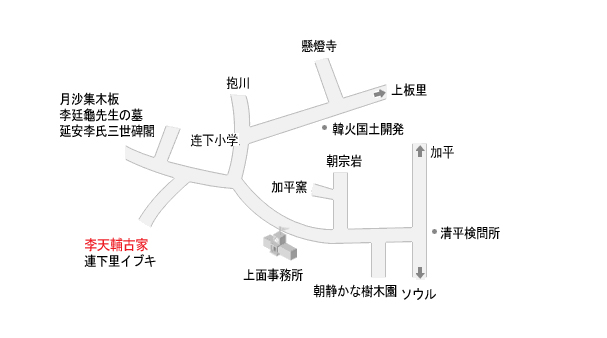この家は黒い牛に乗って通ったと言って黒牛 大監 で有名であった 晉菴 李 天輔 ( 1698~1761) が住んでいた所。 李 天輔 は朝鮮英租の時代に領議政を務め、文と字に達者な文人として知られており、 官位は領 中樞府事 にまであがった。建物は高宗 4 年 (1867) に再建し、 6・25 戦争中に母屋は燃えてなくなり、別棟のみが残った。舎廊は京畿地方でよく見られる平面形態でなく、より古式である ' 一 ' 字形で正面六間、側面一間半で東向きだ。骨組みは高い柱と梁で作られ、断面が四角形の桁を乗せて垂木を差している。よく整えて積まれた長台石の二段基壇の上に高さ 30 ㎝ほどになる台形に整えた礎をおいた。木造建物は高宗の時代に建てた家と見られるが、比較的木を精巧に整えて空間構成も仕組みがある。